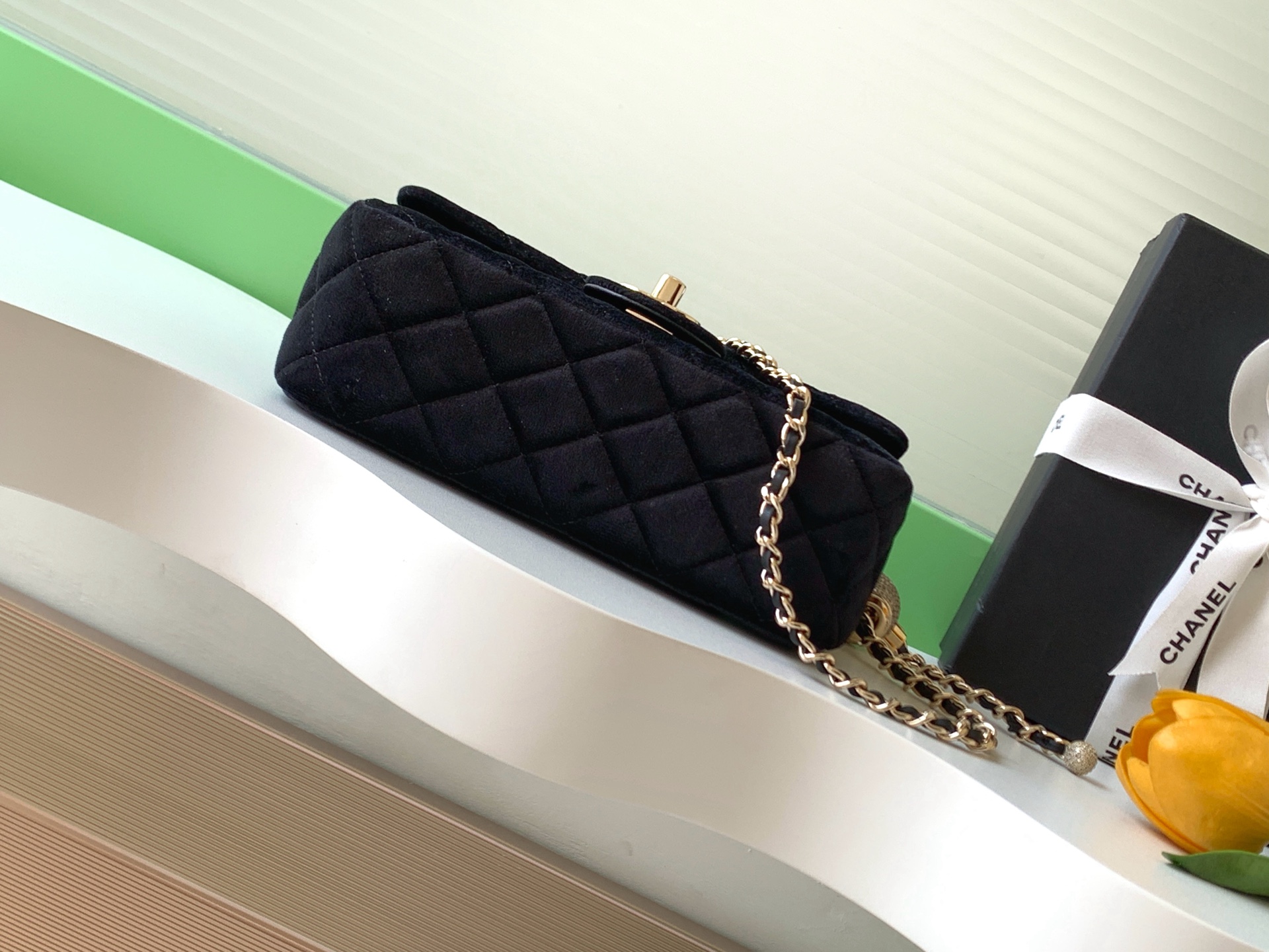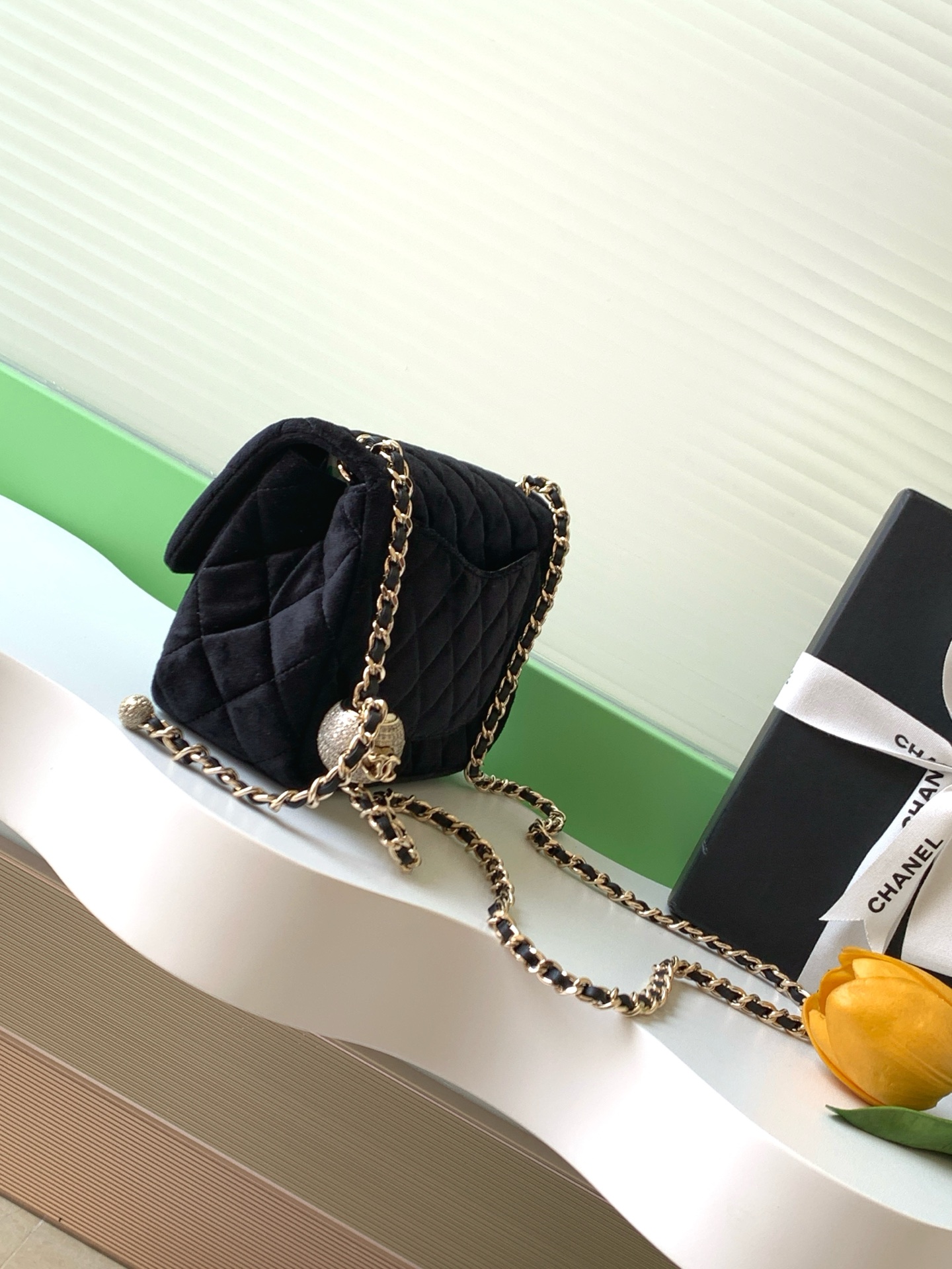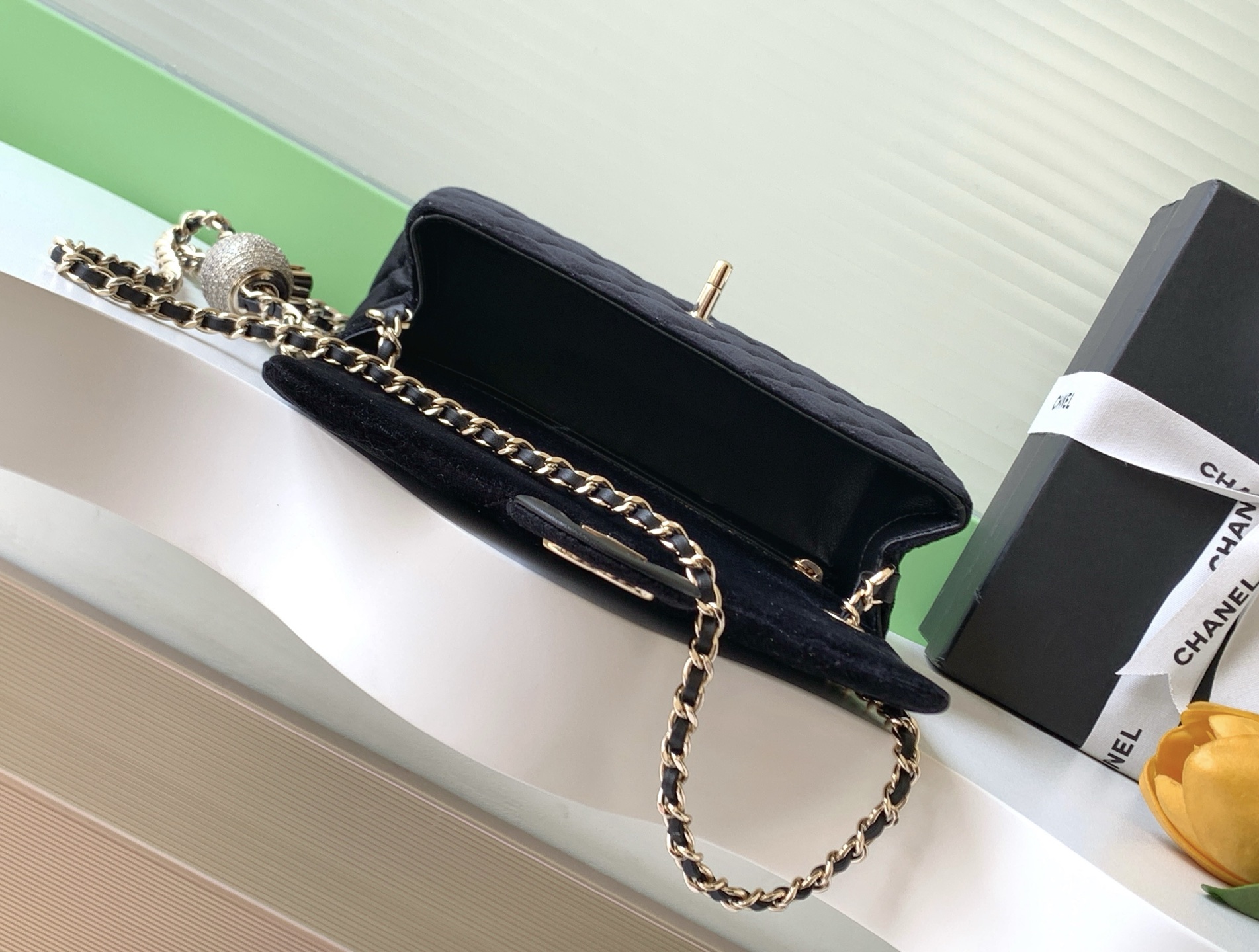 Chanel Classic Flap Bag 25a Velvet with Diamante Ball, Black, 13-20-7 cm