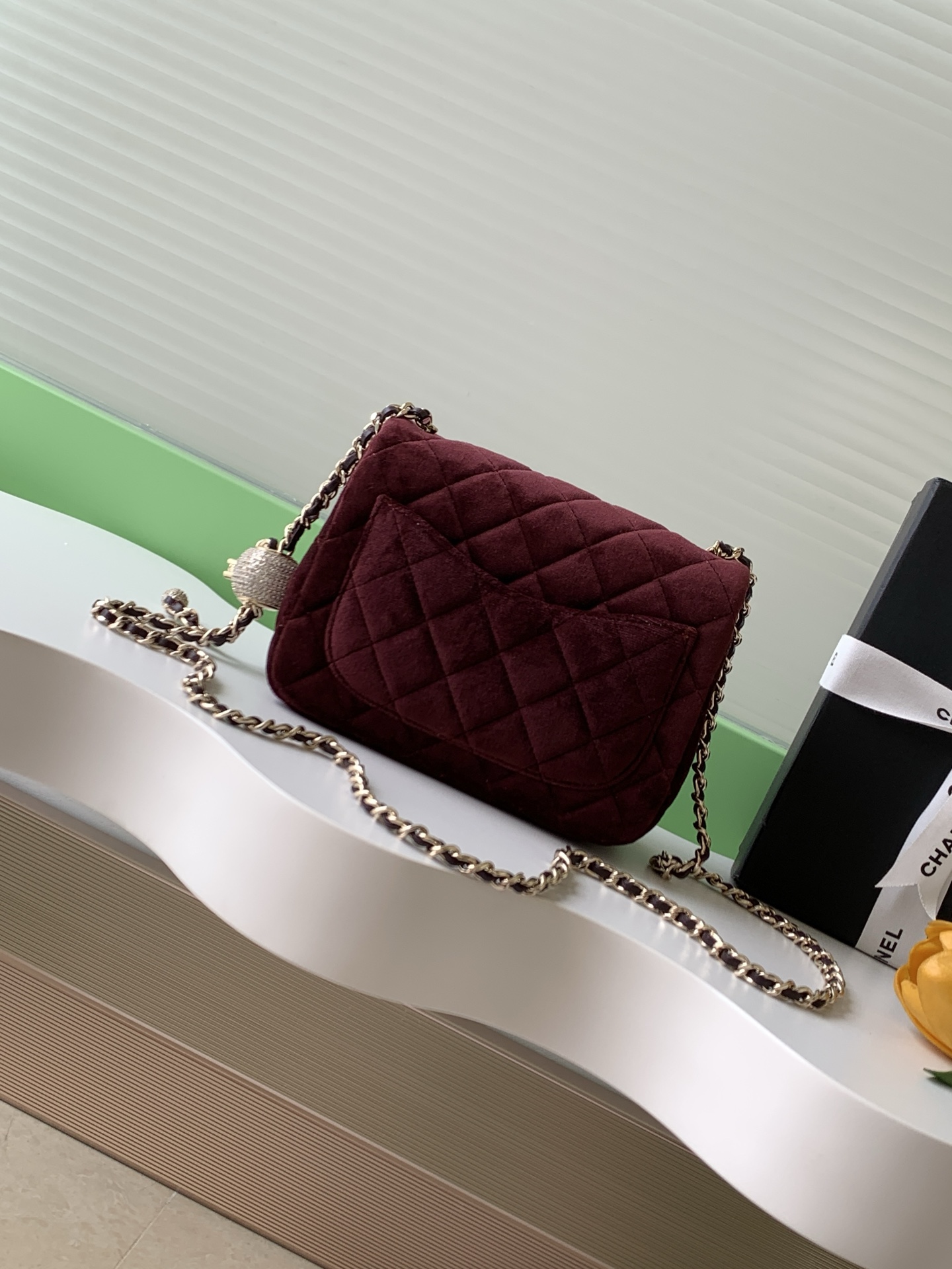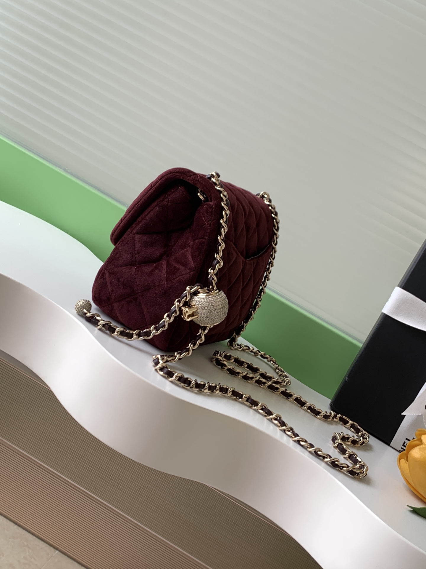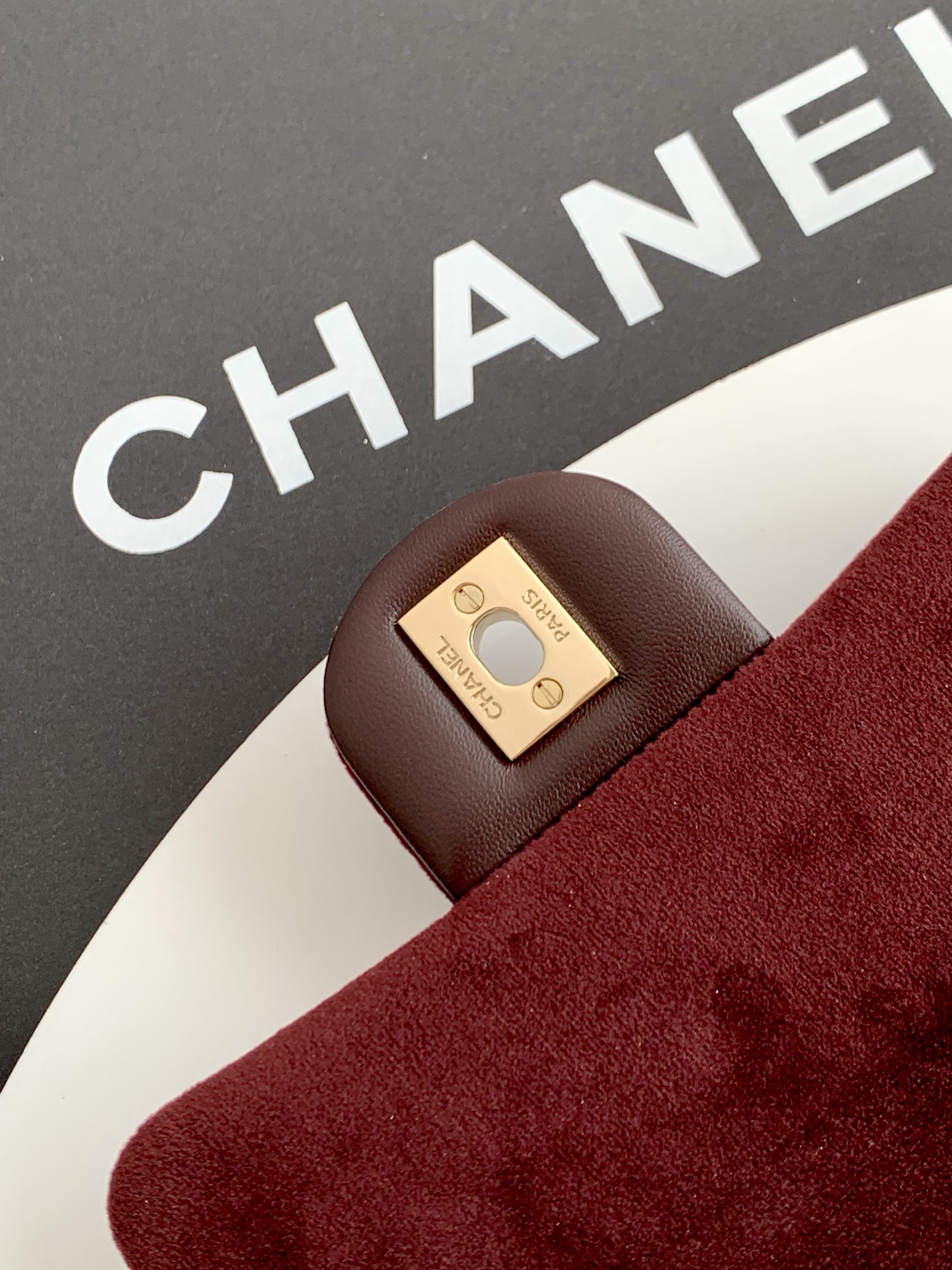Chanel Classic Flap Bag 25A Velvet with Diamond Ball, Burgundy, 13-18-7cm