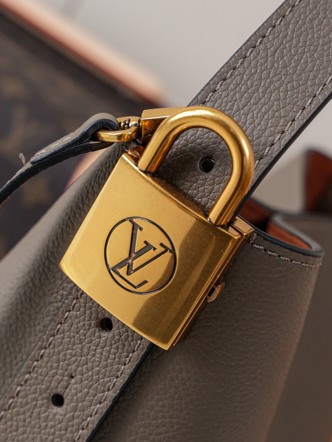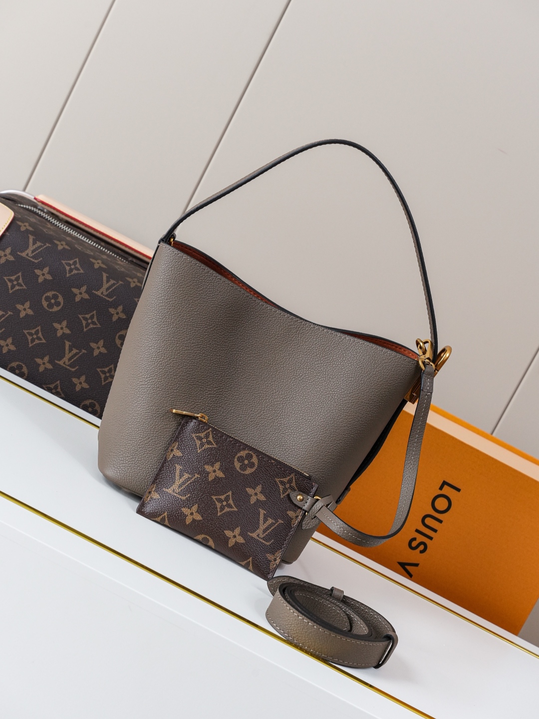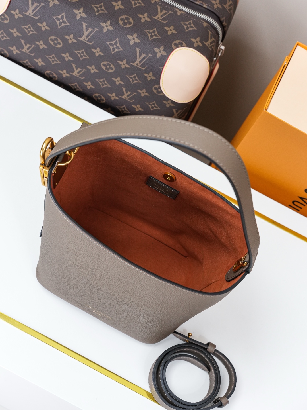 Tags: All In BB Bag, Compact Shoulder Bag, Designer Bucket Bag, Gray Leather Handbag, Louis Vuitton Bucket Bag, Monogram Pocket Bag