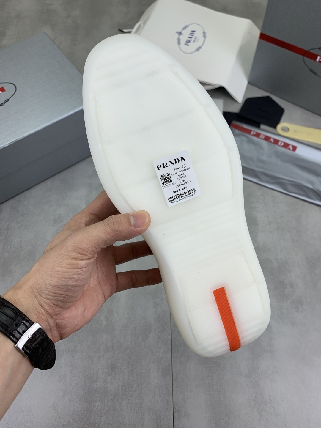 These Prada men's sneakers are a blend of style and comfort, perfect for the fashion-forward individual. Crafted with meticulous attention to detail, they represent a modern twist on classic footwear.
